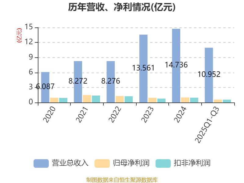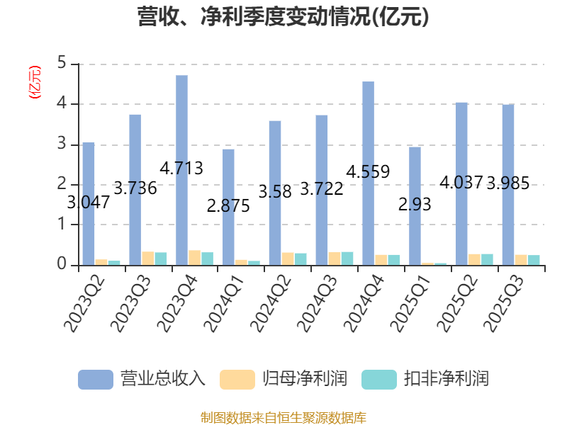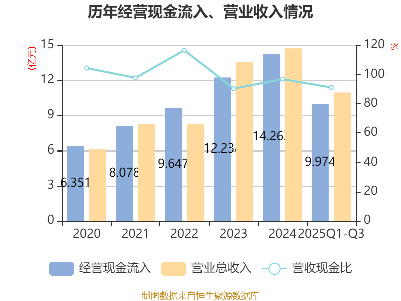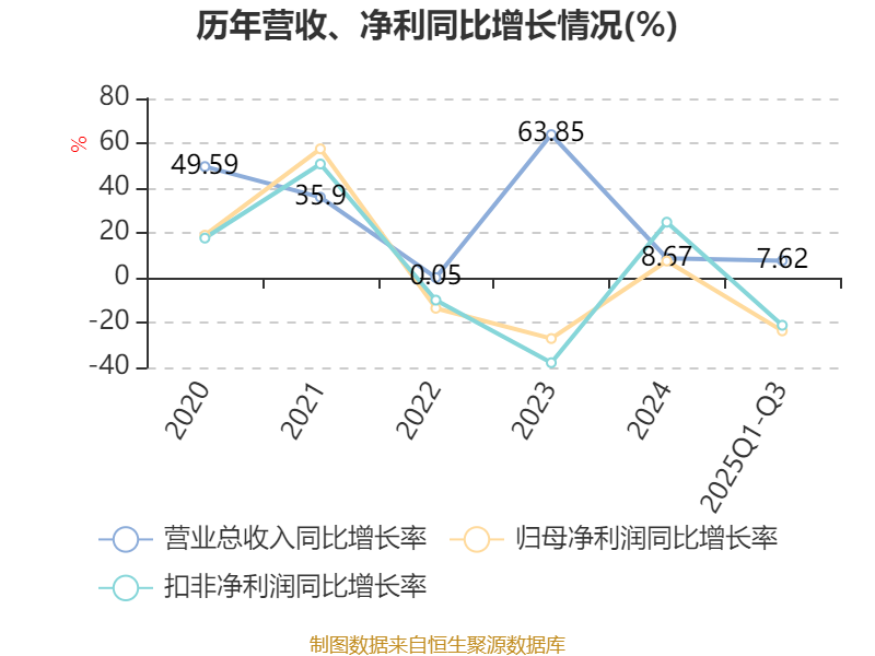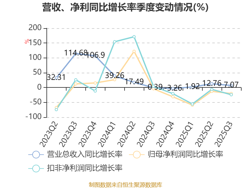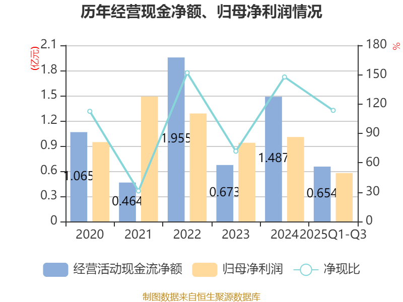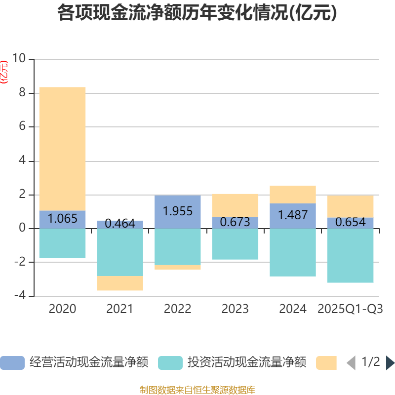2025年前三季度,公司经营活动现金流净额为6544.07万元,同比下降74.72%;筹资活动现金流净额1.29亿元,同比增加1.69亿元;投资活动现金流净额-3.2亿元,上年同期为-3.42亿元。