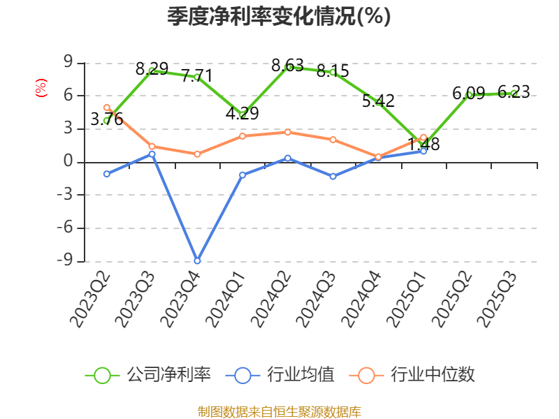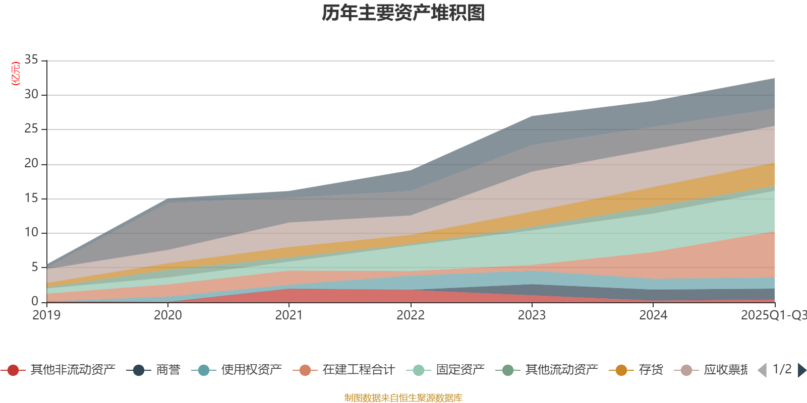资产重大变化方面,截至2025年三季度末,公司在建工程合计较上年末增加73.19%,占公司总资产比重上升7.37个百分点;货币资金较上年末减少23.11%,占公司总资产比重下降3.46个百分点;应收票据及应收账款较上年末减少2.33%,占公司总资产比重下降2.3个百分点;其他流动资产较上年末减少32.8%,占公司总资产比重下降1.41个百分点。