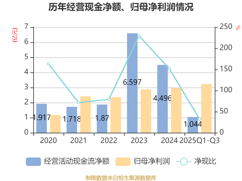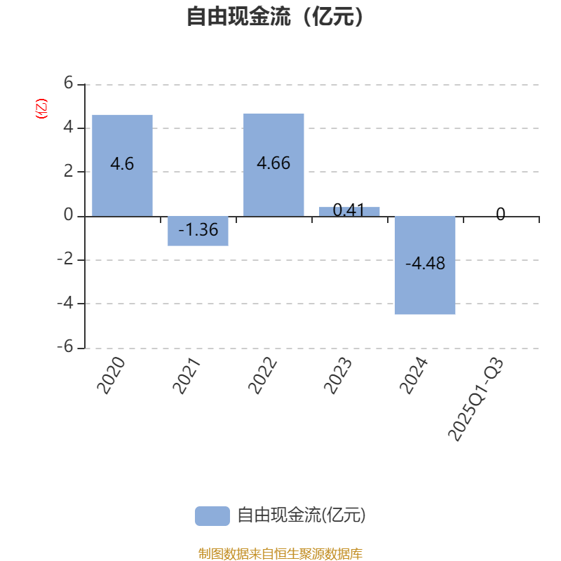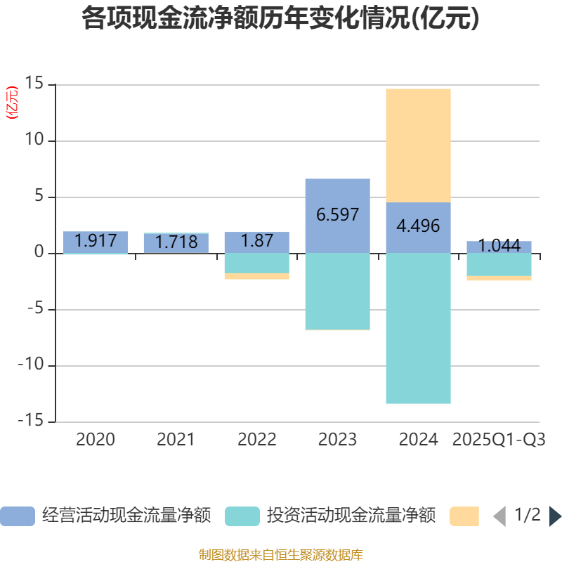 2025年前三季度,公司经营活动现金流净额为1.04亿元,同比下降76.55%;筹资活动现金流净额-4010.09万元,同比减少10.58亿元;投资活动现金流净额-2.05亿元,上年同期为-11.24亿元。