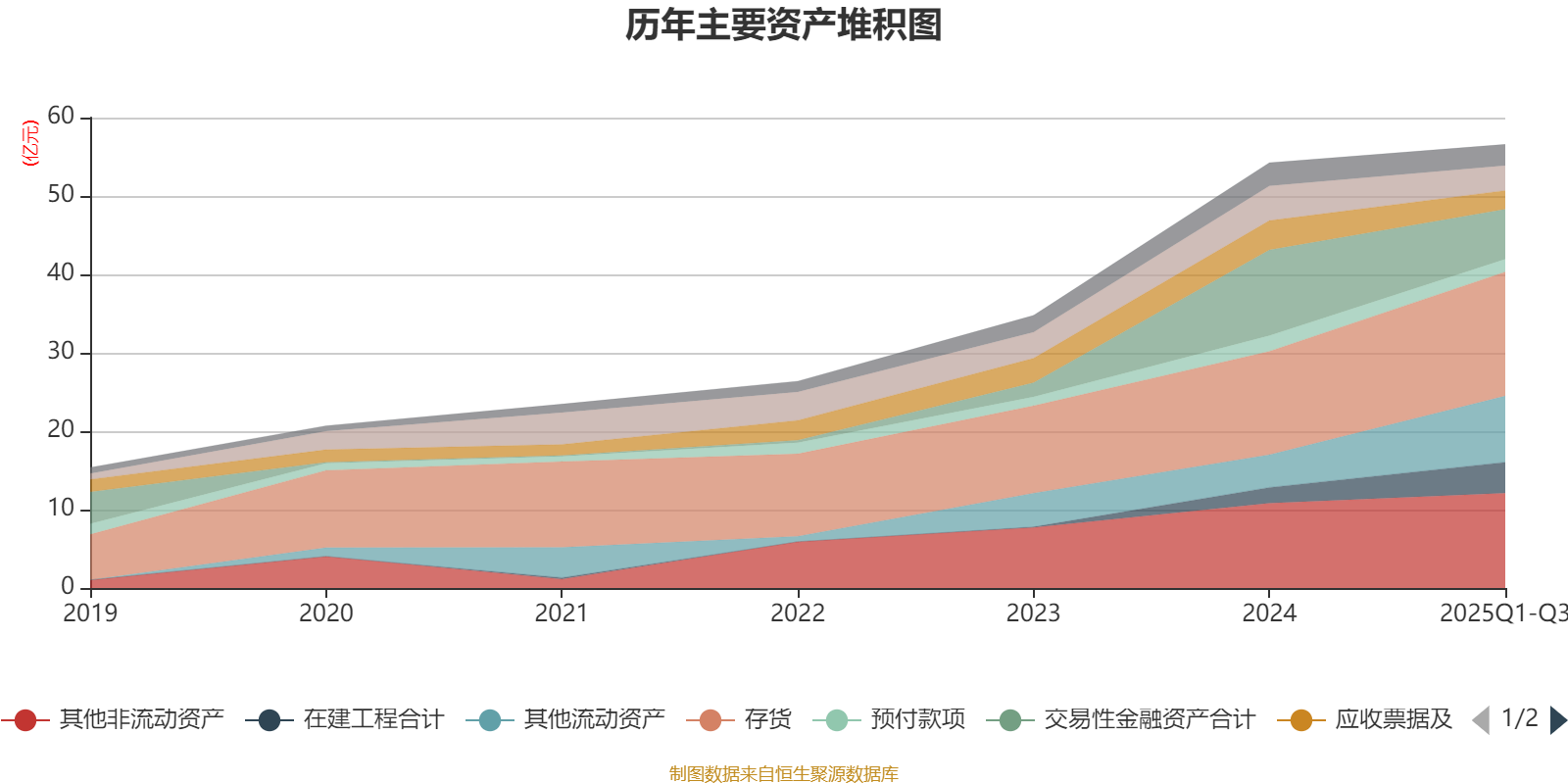 资产重大变化方面,截至2025年三季度末,公司交易性金融资产合计较上年末减少41.84%,占公司总资产比重下降8.91个百分点;其他流动资产较上年末增加102.02%,占公司总资产比重上升7.22个百分点;存货较上年末增加20.1%,占公司总资产比重上升3.68个百分点;在建工程合计较上年末增加96.23%,占公司总资产比重上升3.26个百分点。