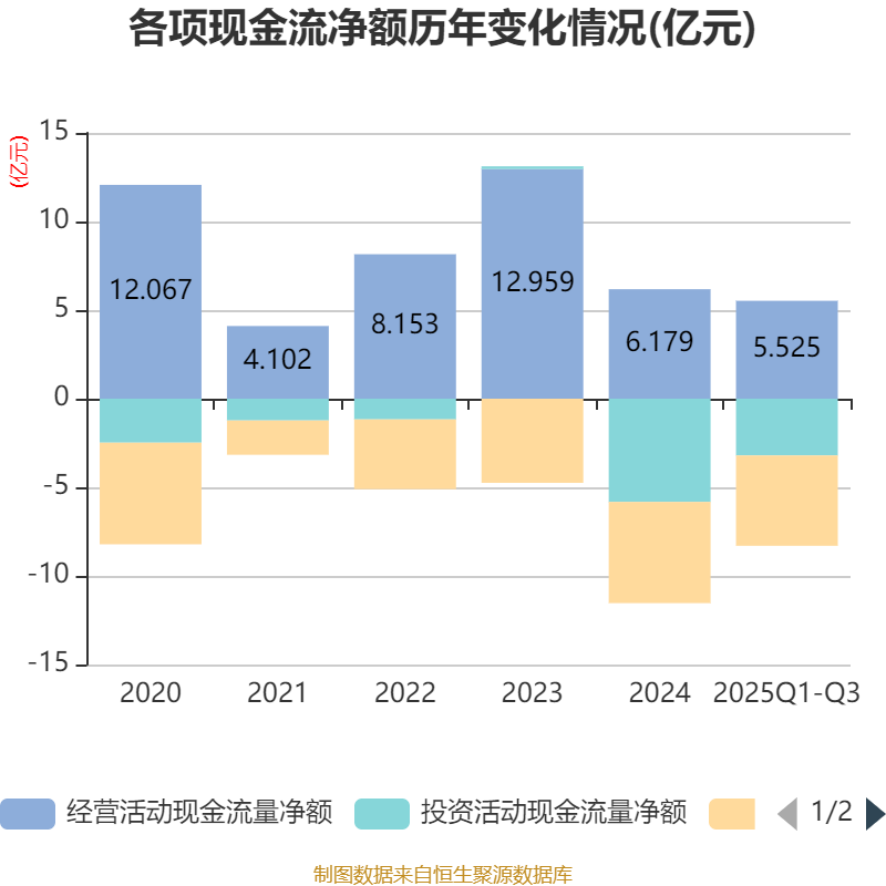 2025年前三季度,公司经营活动现金流净额为5.53亿元,同比下降44.25%;筹资活动现金流净额-5.1亿元,同比减少2.77亿元;投资活动现金流净额-3.2亿元,上年同期为-3.5亿元。