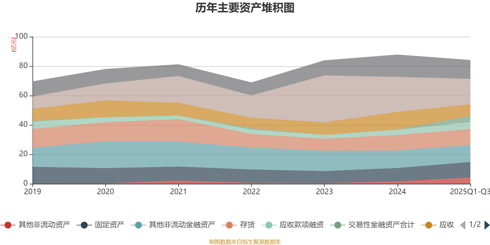 资产重大变化方面,截至2025年三季度末,公司货币资金较上年末减少26.9%,占公司总资产比重下降6.41个百分点;交易性金融资产合计较上年末增加2826.27%,占公司总资产比重上升4.87个百分点;应收票据及应收账款较上年末减少35.13%,占公司总资产比重下降4.45个百分点;其他非流动资产较上年末增加177.4%,占公司总资产比重上升3.33个百分点。