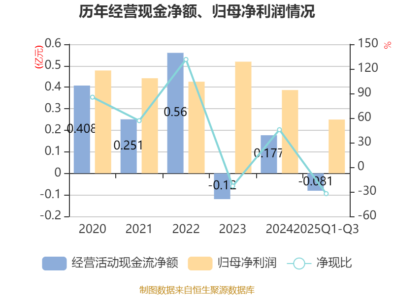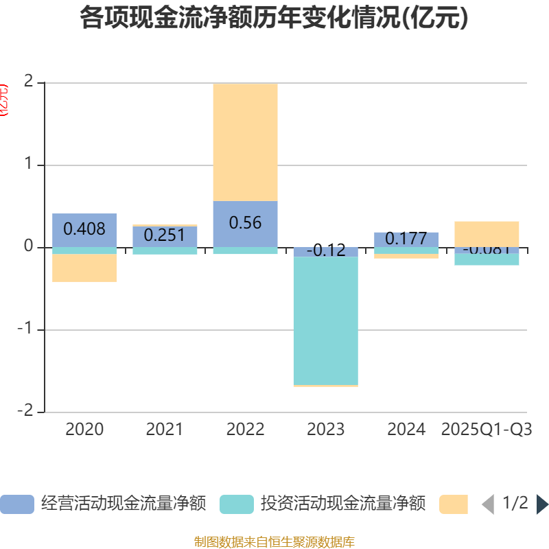 2025年前三季度,公司经营活动现金流净额为-807.32万元,同比减少2524.7万元;筹资活动现金流净额3112.12万元,同比增加2139.69万元;投资活动现金流净额-1397.22万元,上年同期为-1928.82万元。