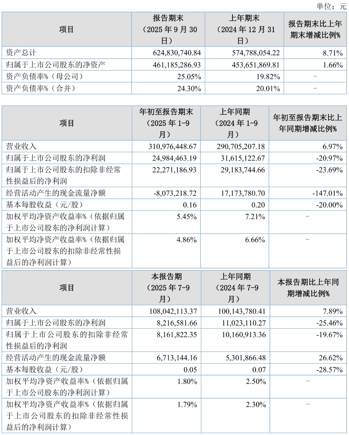 2025年前三季度,公司流动比率为3.49,速动比率为2.33。