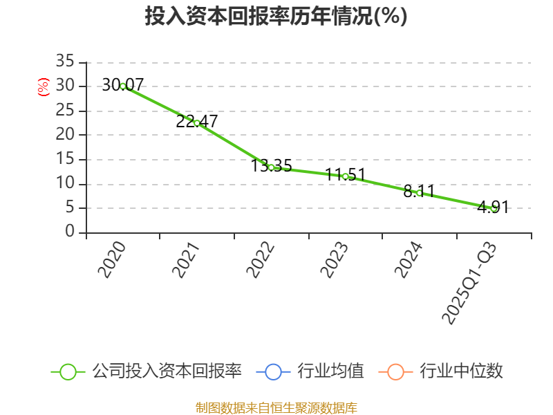 盈利能力方面, 2025年前三季度公司加权平均净资产收益率为5.45%,同比下降1.76个百分点。公司2025年前三季度投入资本回报率为4.91%,较上年同期下降1.56个百分点。