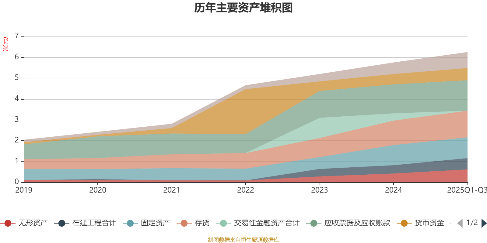 资产重大变化方面,截至2025年三季度末,公司交易性金融资产合计较上年末减少100%,占公司总资产比重下降6.09个百分点;无形资产较上年末增加46.13%,占公司总资产比重上升2.52个百分点;在建工程合计较上年末增加36.49%,占公司总资产比重上升1.76个百分点;应收款项融资较上年末增加109.19%,占公司总资产比重上升1.57个百分点。