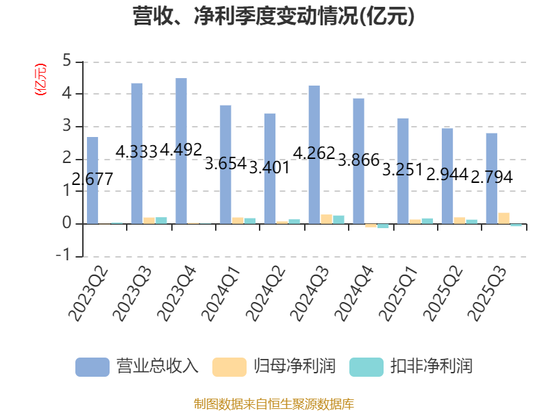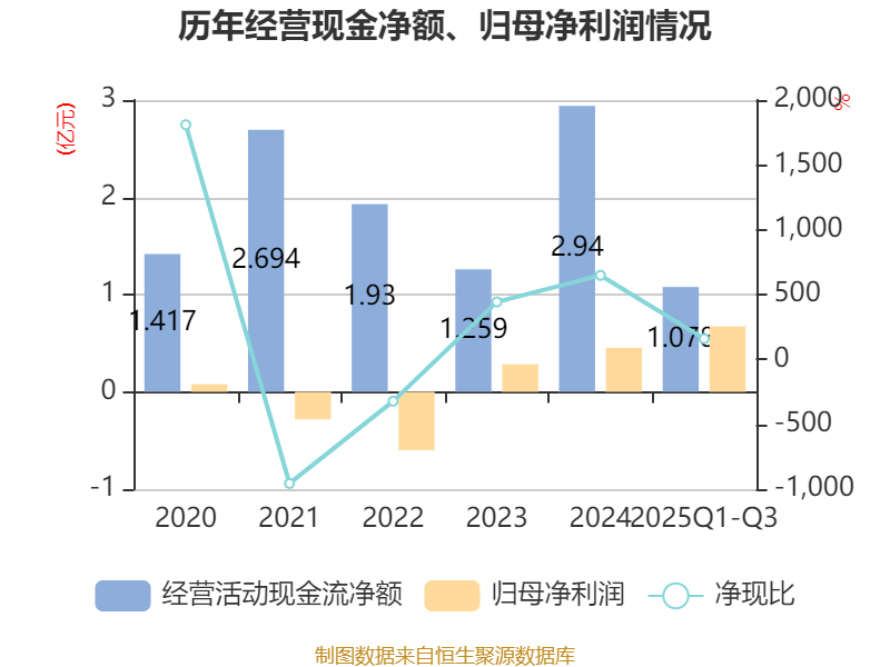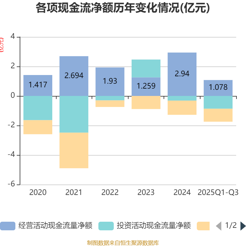 2025年前三季度,公司经营活动现金流净额为1.08亿元,同比下降33.79%;筹资活动现金流净额-8769.17万元,同比减少2249.15万元;投资活动现金流净额-8669万元,上年同期为-5693.17万元。