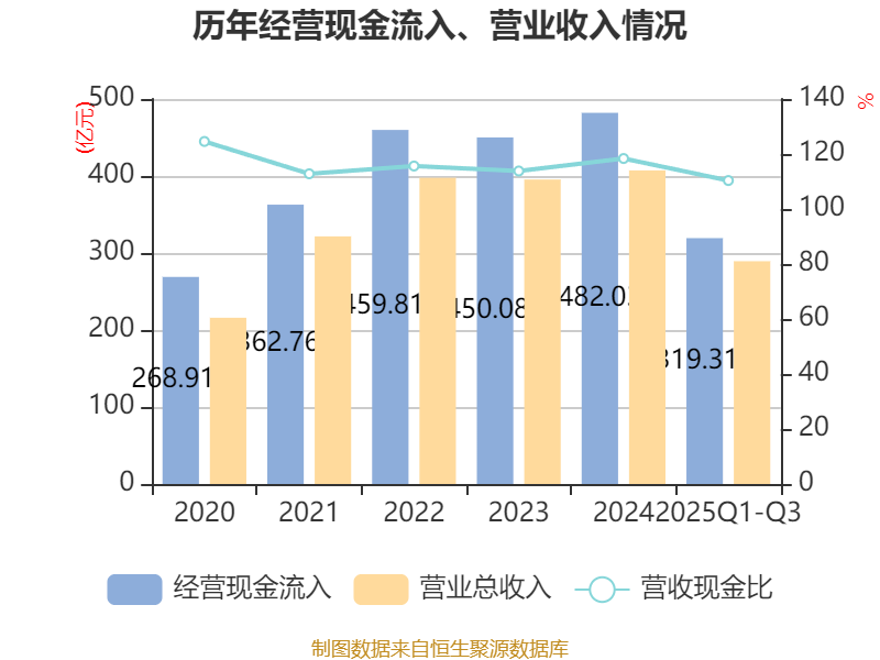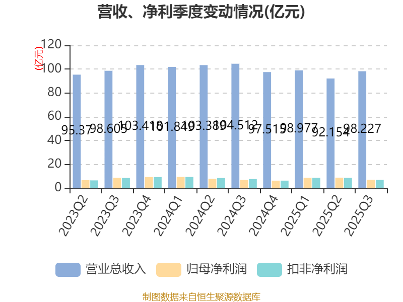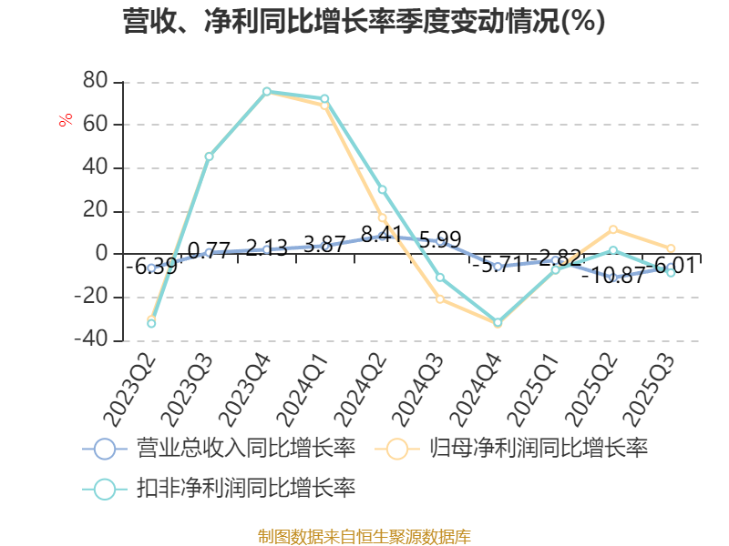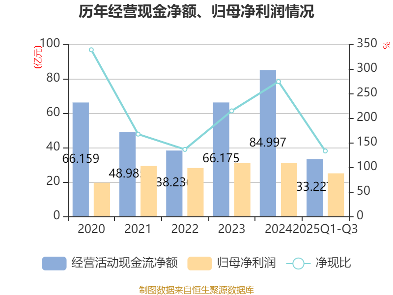 2025年前三季度,公司经营活动现金流净额为33.23亿元,同比下降42.78%;筹资活动现金流净额30.09亿元,同比增加47.11亿元;投资活动现金流净额-69.29亿元,上年同期为-38.81亿元。