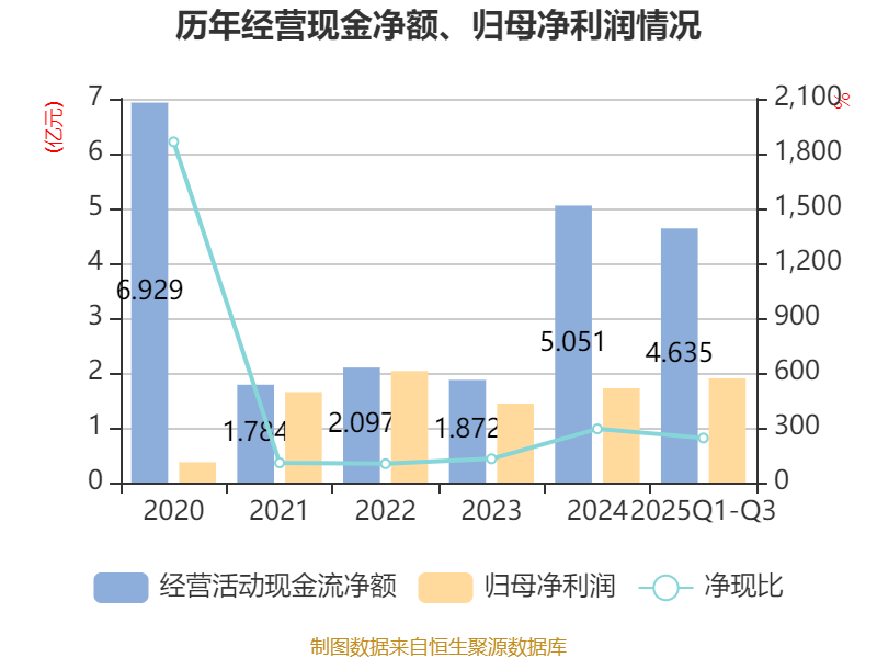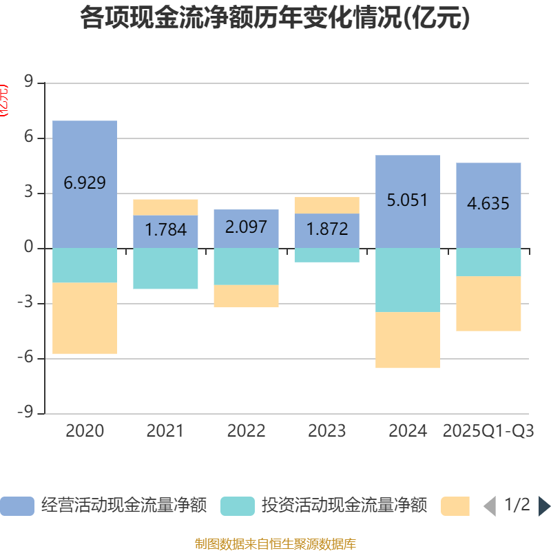 2025年前三季度,公司经营活动现金流净额为4.63亿元,同比增长102.78%;筹资活动现金流净额-2.98亿元,同比减少3431.98万元;投资活动现金流净额-1.54亿元,上年同期为-1.7亿元。