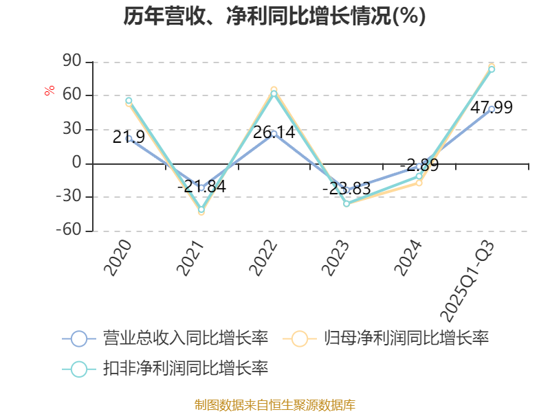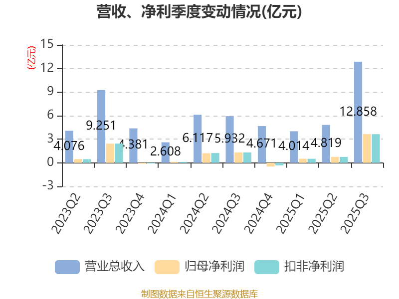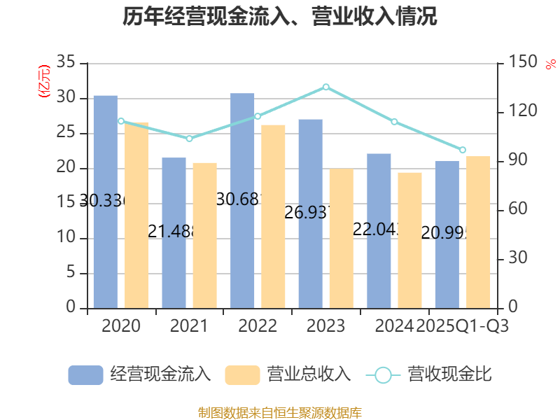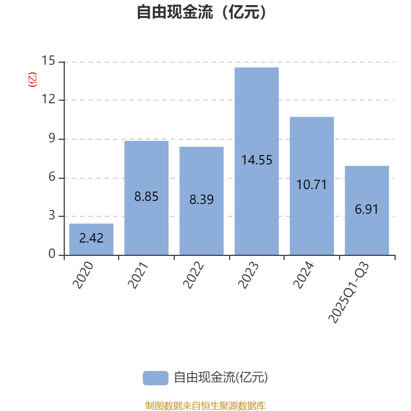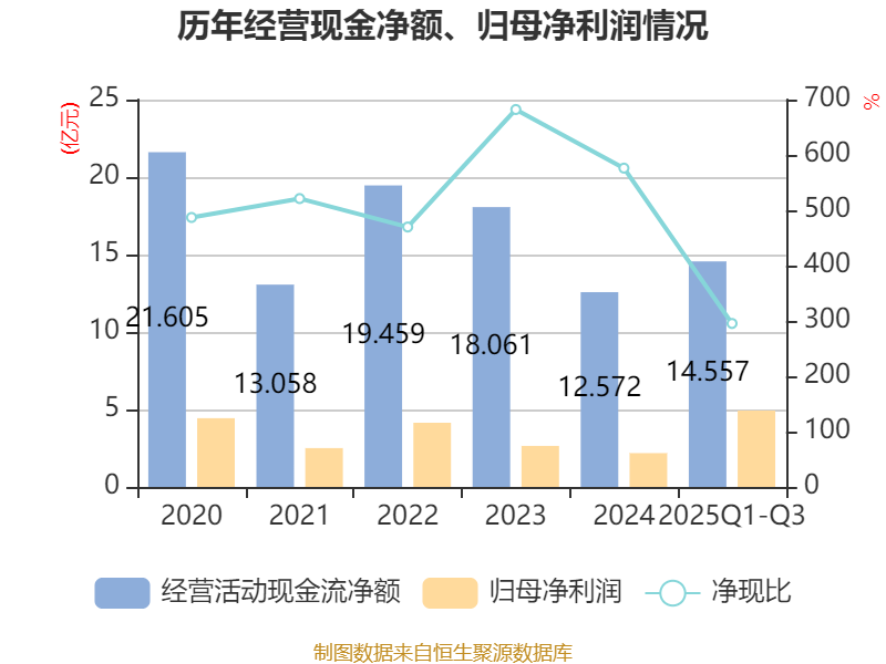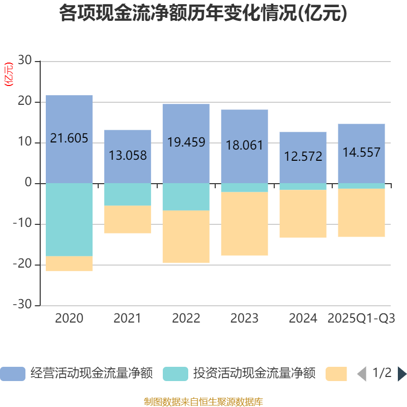 2025年前三季度,公司经营活动现金流净额为14.56亿元,同比增长27.37%;筹资活动现金流净额-11.83亿元,同比减少1.51亿元;投资活动现金流净额-1.36亿元,上年同期为-8649.43万元。