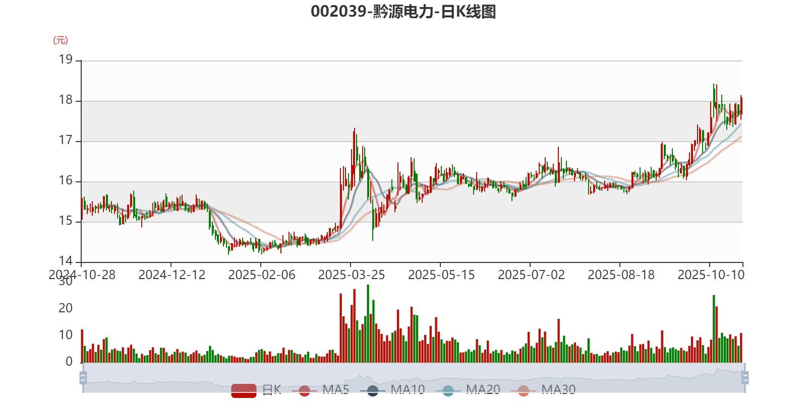 中证智能财讯黔源电力(002039)10月28日披露2025年第三季度报告。前三季度公司实现营业总收入21.69亿元,同比增长47.99%;归母净利润4.93亿元,同比增长85.74%;扣非净利润4.91亿元,同比增长83.32%;经营活动产生的现金流量净额为14.56亿元,同比增长27.37%;报告期内,黔源电力基本每股收益为1.1527元,加权平均净资产收益率为11.89%。