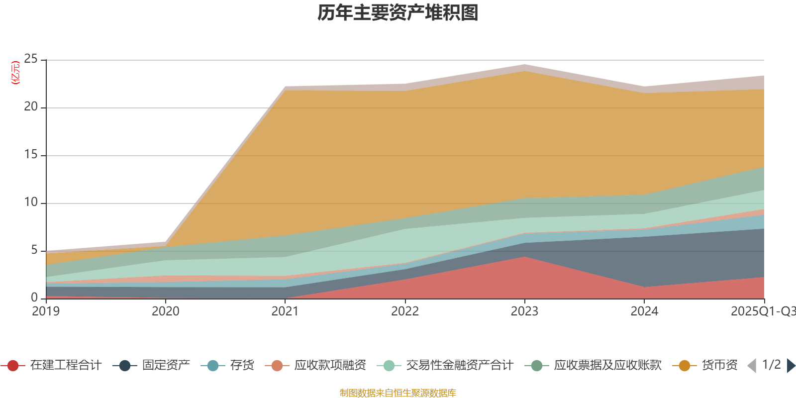 资产重大变化方面,截至2025年三季度末,公司货币资金较上年末减少23.62%,占公司总资产比重下降13.13个百分点;在建工程合计较上年末增加87.26%,占公司总资产比重上升4.22个百分点;存货较上年末增加89.78%,占公司总资产比重上升2.78个百分点;应收款项融资较上年末增加415.99%,占公司总资产比重上升2.07个百分点。