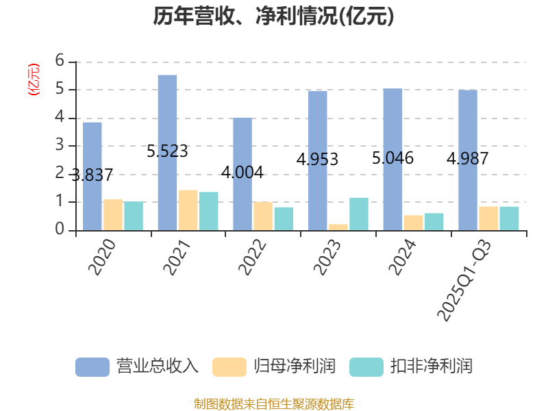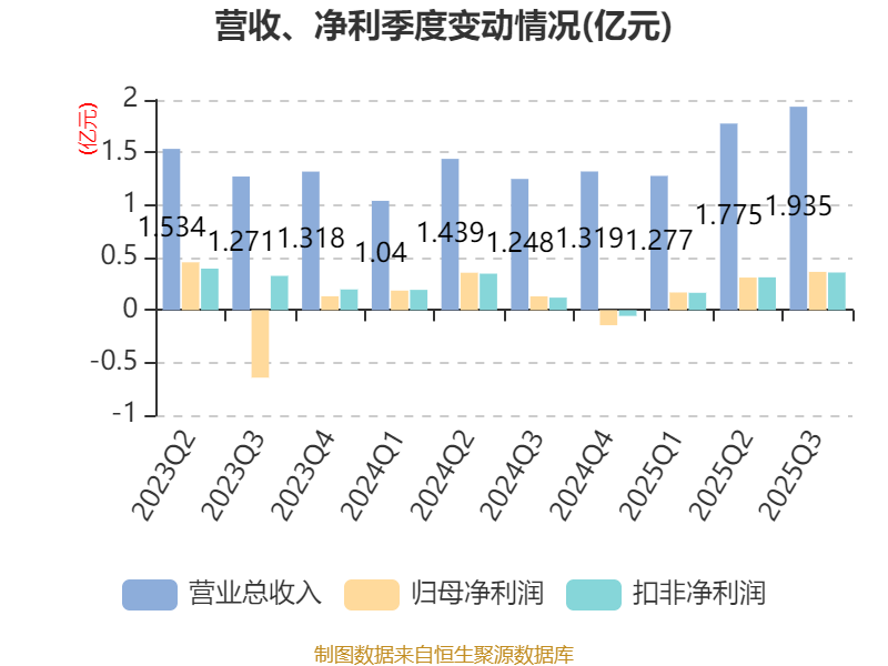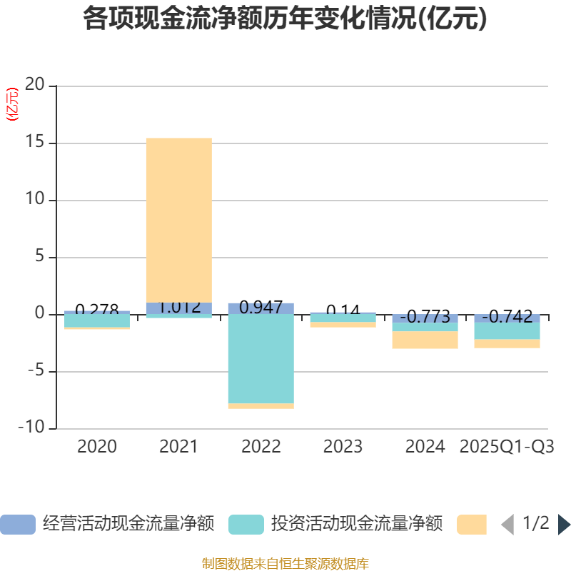 2025年前三季度,公司经营活动现金流净额为-7415.47万元,同比增加2678.82万元;筹资活动现金流净额-7562.16万元,同比增加5835.6万元;投资活动现金流净额-1.48亿元,上年同期为-1.42亿元。