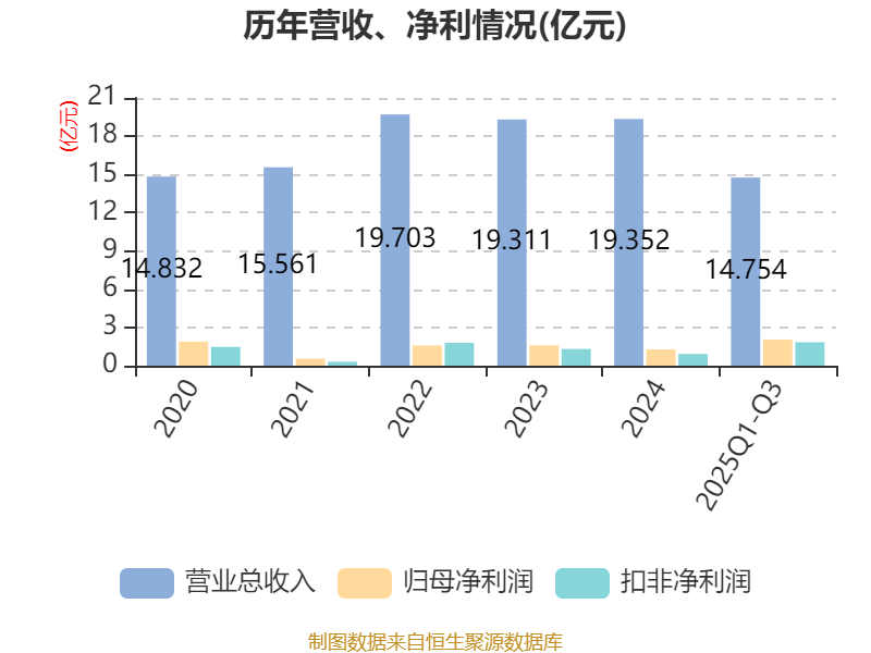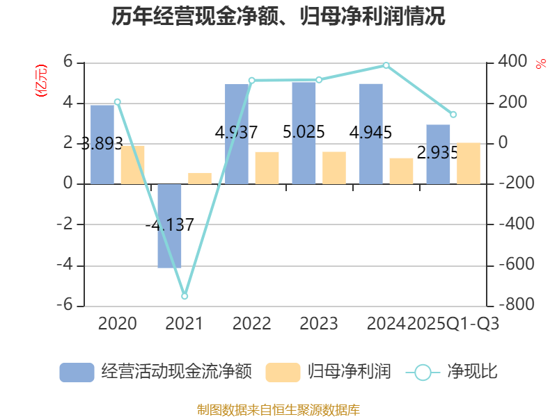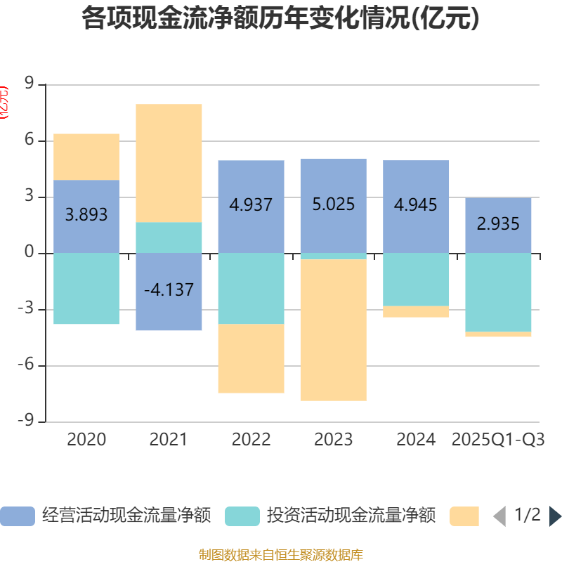 2025年前三季度,公司经营活动现金流净额为2.94亿元,同比下降2.74%;筹资活动现金流净额-2543.75万元,同比减少2.01亿元;投资活动现金流净额-4.22亿元,上年同期为-1.57亿元。