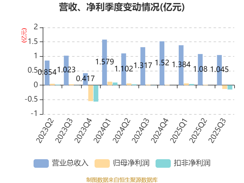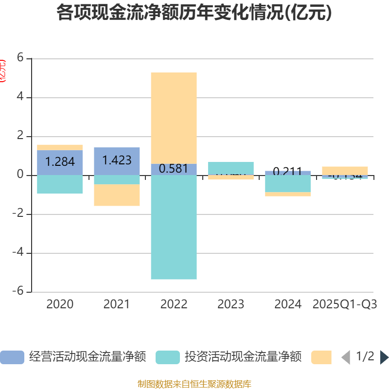 2025年前三季度,公司经营活动现金流净额为-1342.77万元,同比增加1603.36万元;筹资活动现金流净额4353.22万元,同比增加1328.3万元;投资活动现金流净额-628.9万元,上年同期为-1.14亿元。
