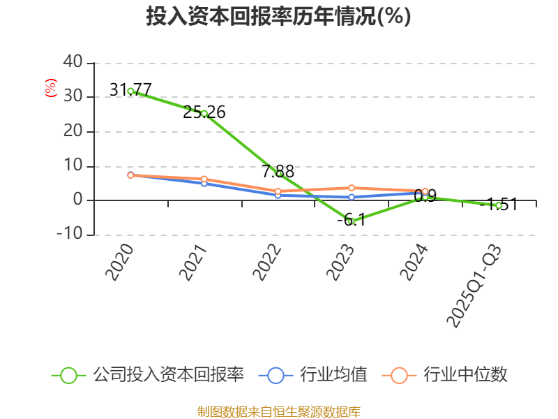 盈利能力方面, 2025年前三季度公司加权平均净资产收益率为-0.44%,同比下降2.42个百分点。公司2025年前三季度投入资本回报率为-1.51%,较上年同期下降2.64个百分点。