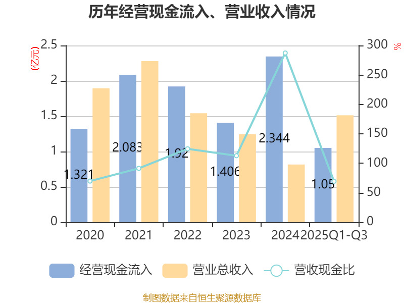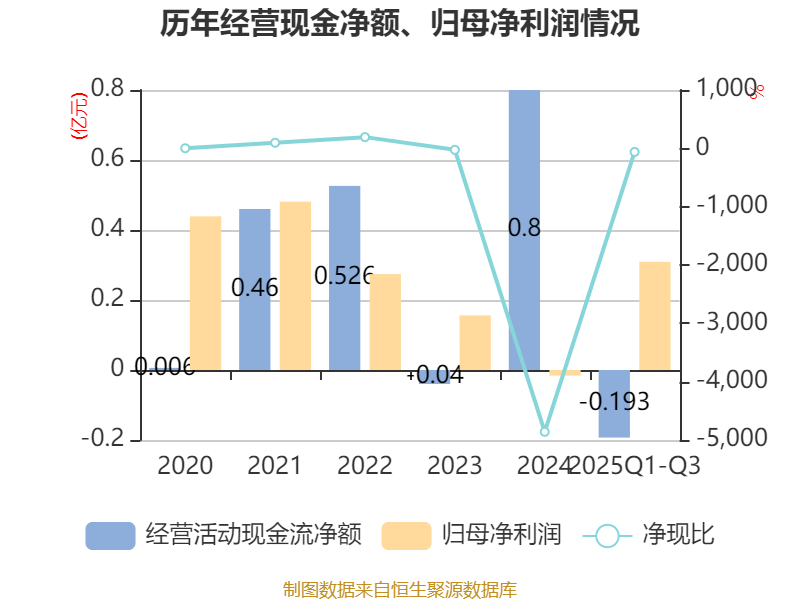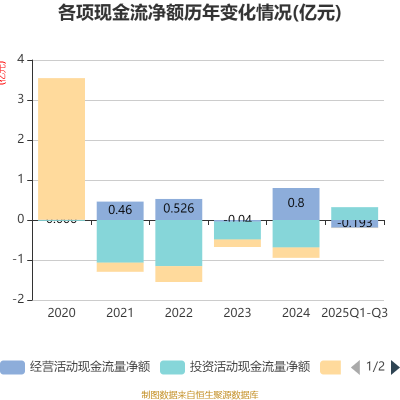 2025年前三季度,公司经营活动现金流净额为-1929.2万元,同比减少6590.42万元;筹资活动现金流净额-83.66万元,同比增加2447.29万元;投资活动现金流净额3209.74万元,上年同期为8768.84万元。