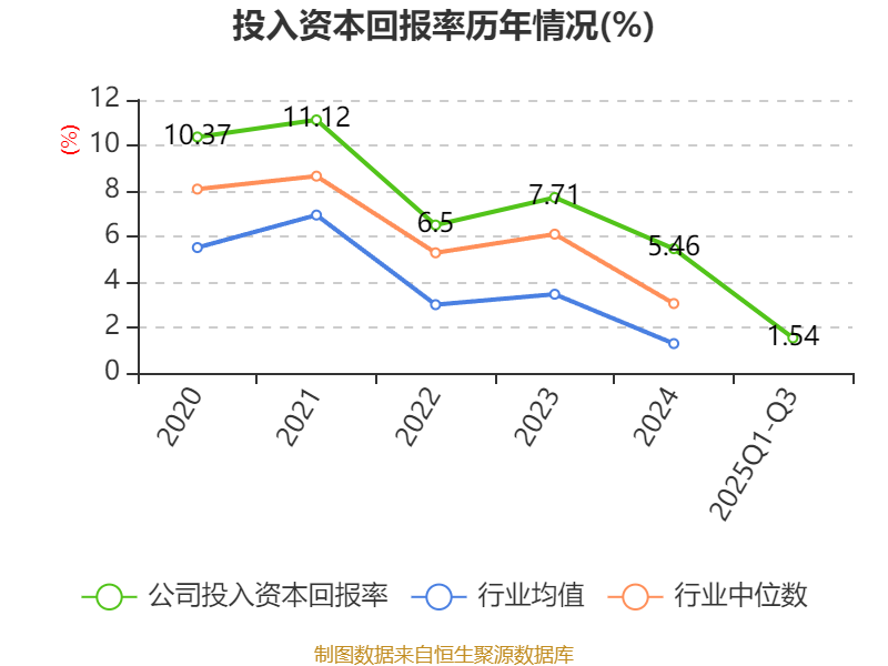 盈利能力方面, 2025年前三季度公司加权平均净资产收益率为1.68%,同比下降1.44个百分点。公司2025年前三季度投入资本回报率为1.54%,较上年同期下降1.13个百分点。