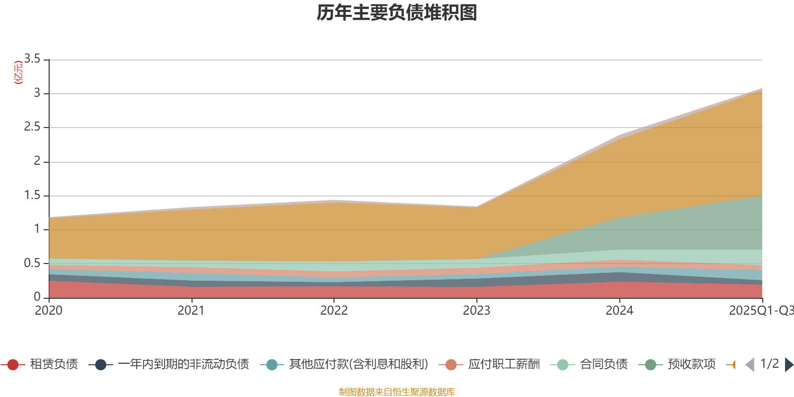 负债重大变化方面,截至2025年三季度末,公司应付票据及应付账款较上年末增加34.31%,占公司总资产比重上升2.96个百分点;预收款项较上年末增加68.94%,占公司总资产比重上升2.8个百分点;一年内到期的非流动负债较上年末减少53.47%,占公司总资产比重下降0.84个百分点;合同负债较上年末增加55.87%,占公司总资产比重上升0.67个百分点。