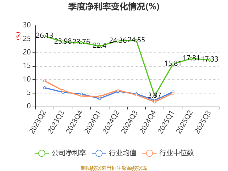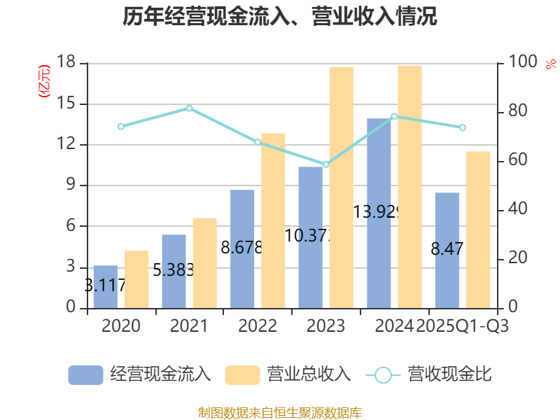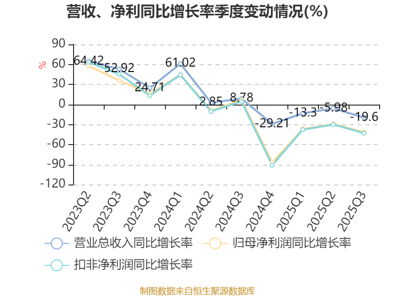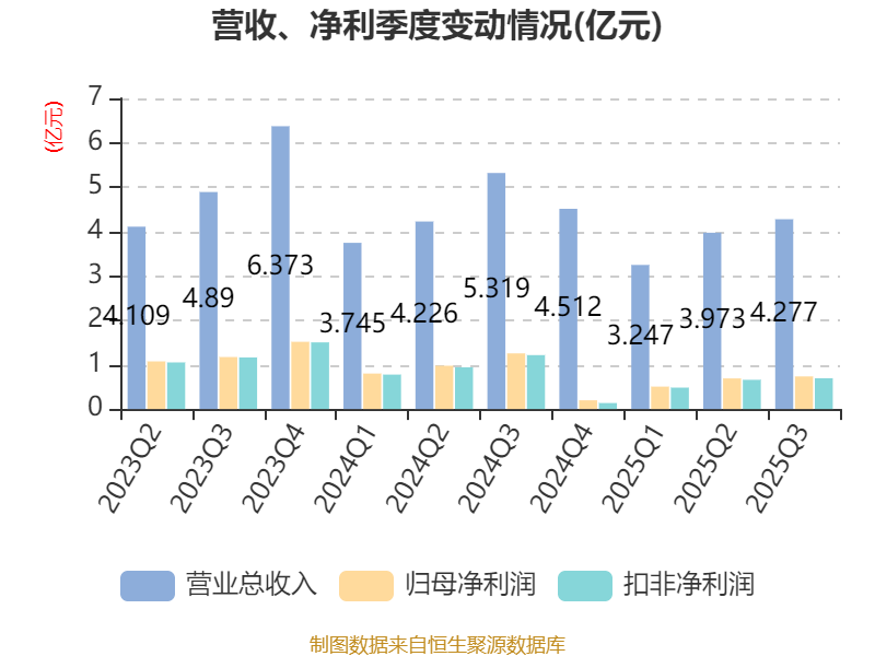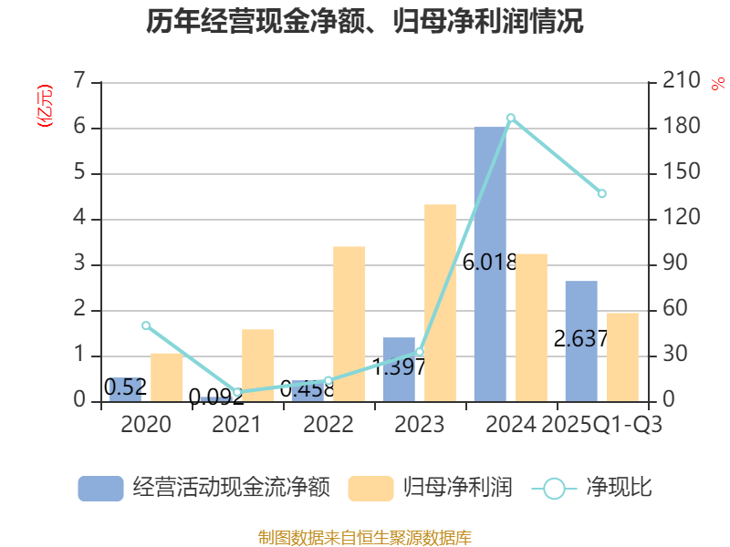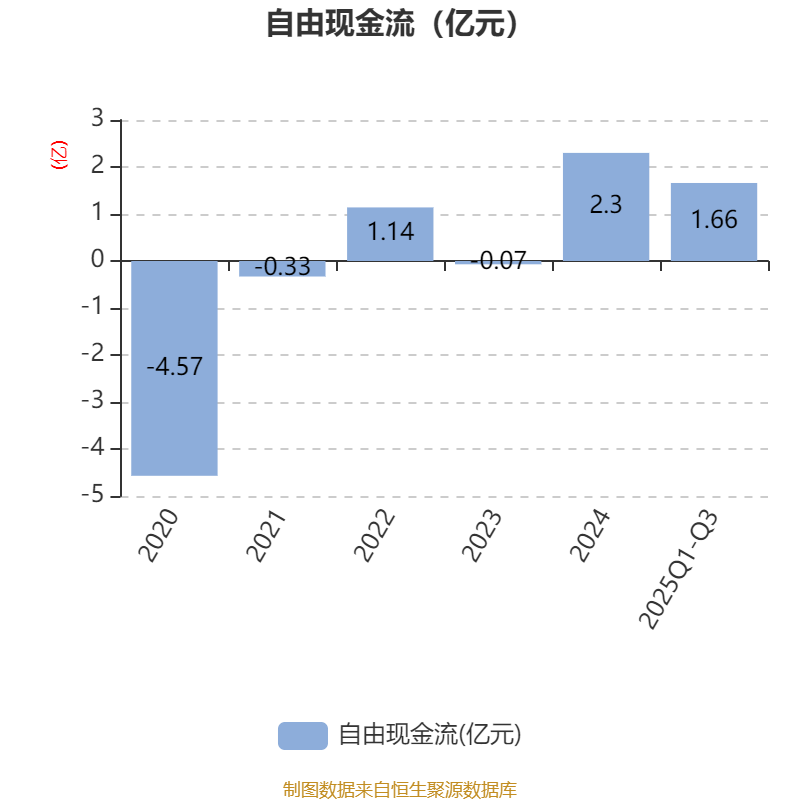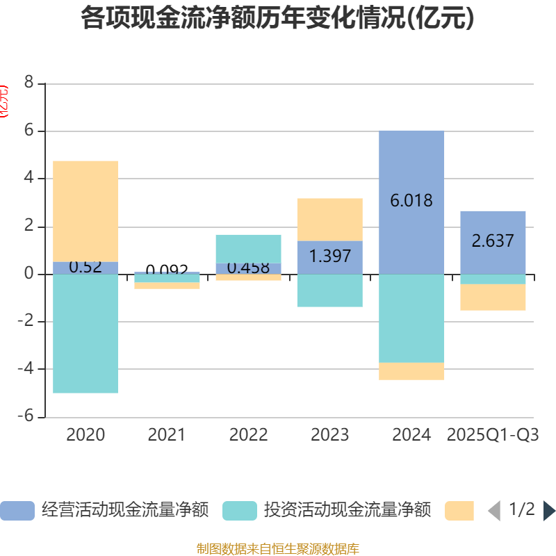 2025年前三季度,公司经营活动现金流净额为2.64亿元,同比下降23.71%;筹资活动现金流净额-1.1亿元,同比减少3986.16万元;投资活动现金流净额-4258.12万元,上年同期为-9670.12万元。