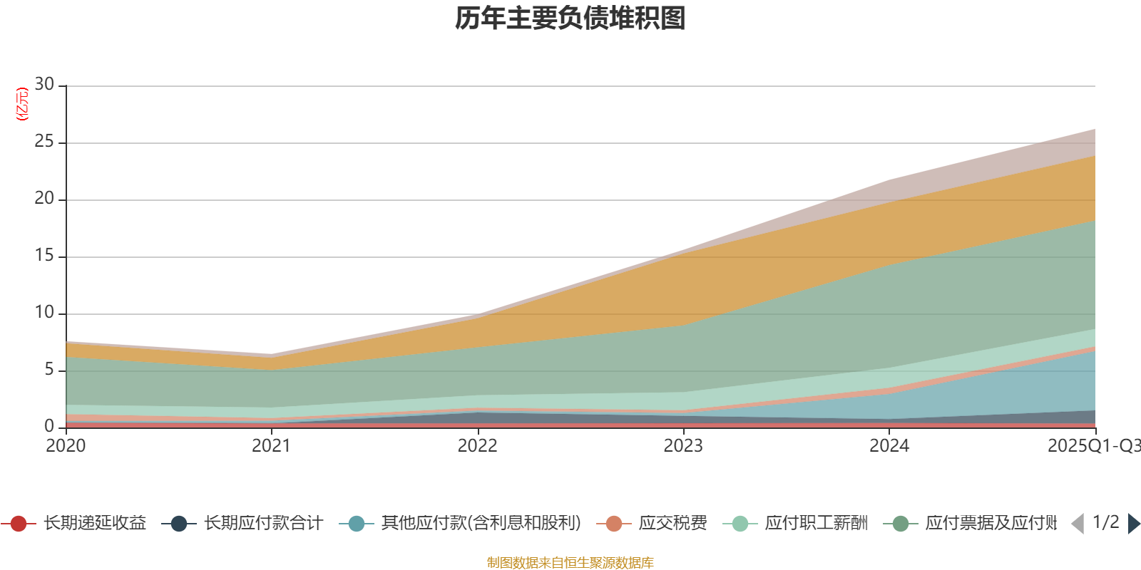 负债重大变化方面,截至2025年三季度末,公司其他应付款(含利息和股利)较上年末增加136.03%,占公司总资产比重上升3.48个百分点;长期应付款合计较上年末增加232.46%,占公司总资产比重上升0.95个百分点;一年内到期的非流动负债较上年末减少58.36%,占公司总资产比重下降0.46个百分点;应付职工薪酬较上年末减少13.12%,占公司总资产比重下降0.44个百分点。