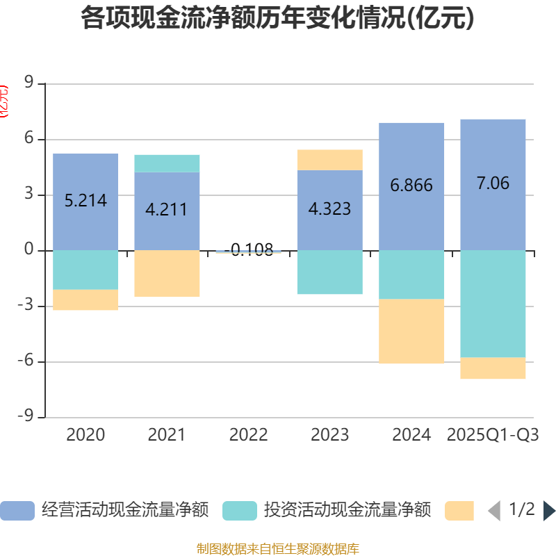 2025年前三季度,公司经营活动现金流净额为7.06亿元,同比增长57.06%;筹资活动现金流净额-1.15亿元,同比增加6260.7万元;投资活动现金流净额-5.8亿元,上年同期为-8502.67万元。