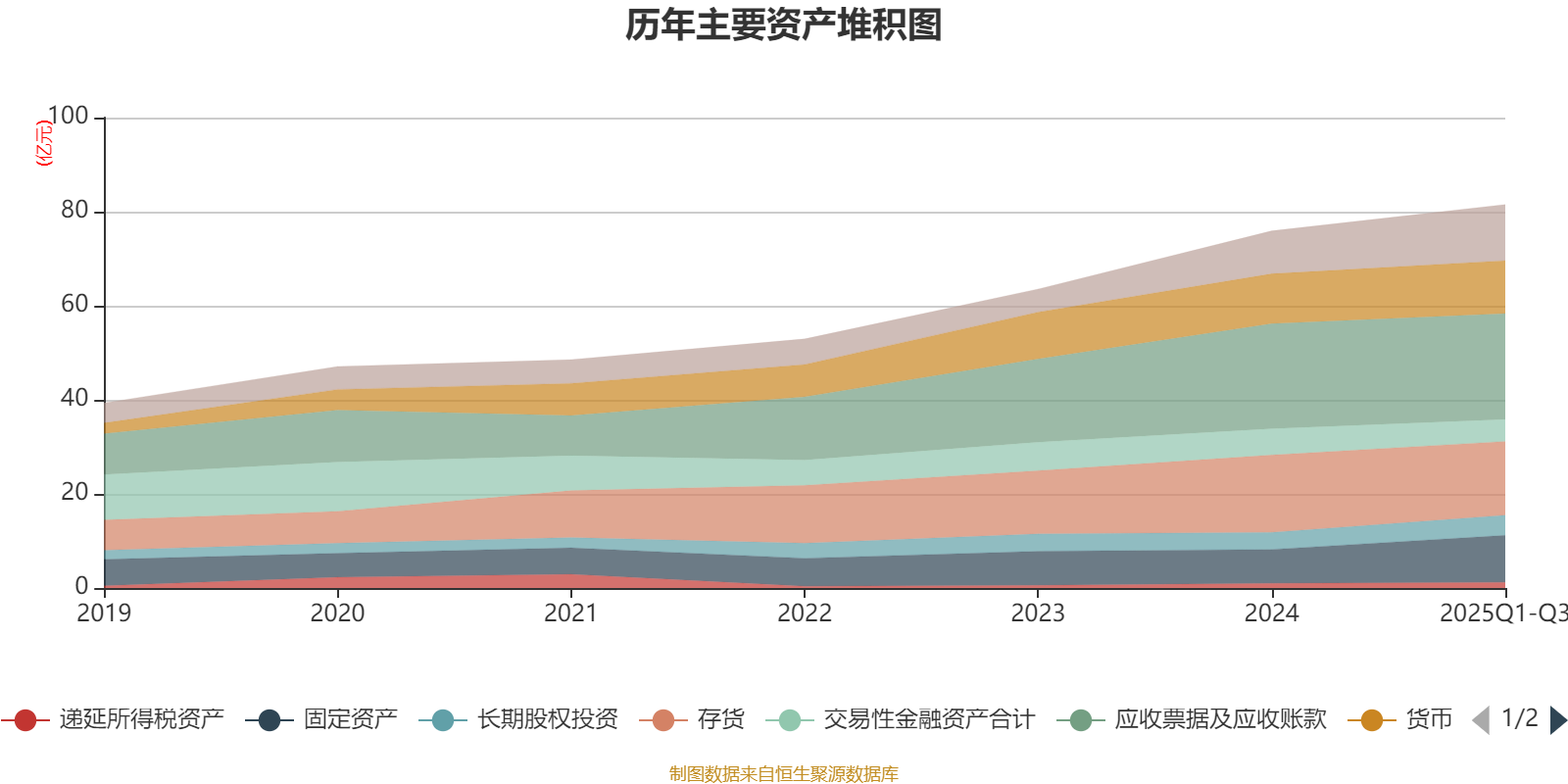 资产重大变化方面,截至2025年三季度末,公司固定资产较上年末增加38.33%,占公司总资产比重上升2.73个百分点;其他流动资产较上年末增加125.92%,占公司总资产比重上升2.54个百分点;存货较上年末减少4.69%,占公司总资产比重下降2.44个百分点;应收票据及应收账款较上年末增加0.85%,占公司总资产比重下降1.79个百分点。