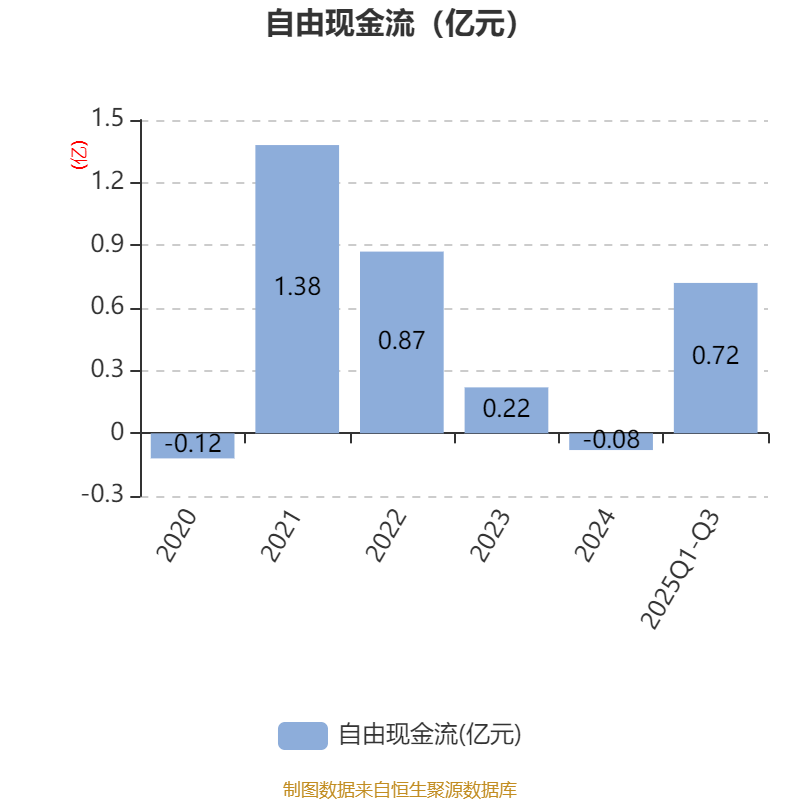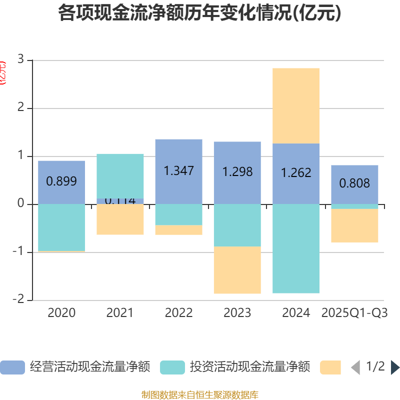 2025年前三季度,公司经营活动现金流净额为8083.71万元,同比增长15.65%;筹资活动现金流净额-6981.62万元,同比减少2.27亿元;投资活动现金流净额-1030.82万元,上年同期为5753.62万元。