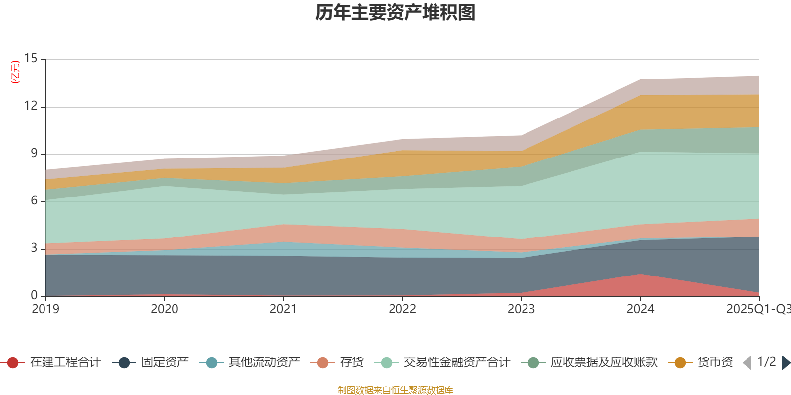 资产重大变化方面,截至2025年三季度末,公司固定资产较上年末增加66.16%,占公司总资产比重上升9.81个百分点;在建工程合计较上年末减少83.72%,占公司总资产比重下降8.64个百分点;交易性金融资产合计较上年末减少10.03%,占公司总资产比重下降3.88个百分点;其他非流动资产较上年末增加606.24%,占公司总资产比重上升1.78个百分点。