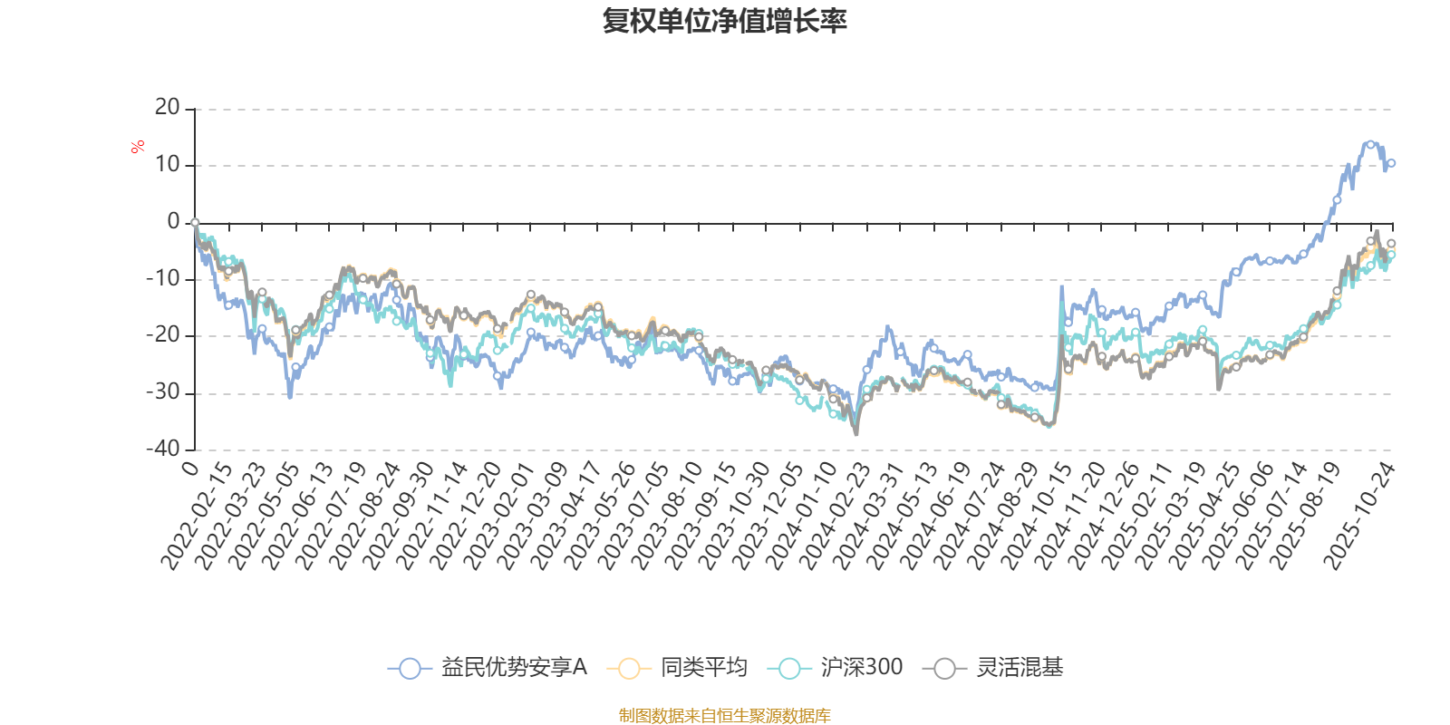 截至10月24日,益民优势安享A近三个月复权单位净值增长率为14.13%,位于同类可比基金516/1287;近半年复权单位净值增长率为21.10%,位于同类可比基金689/1287;近一年复权单位净值增长率为30.49%,位于同类可比基金418/1287;近三年复权单位净值增长率为43.55%,位于同类可比基金165/1286。
