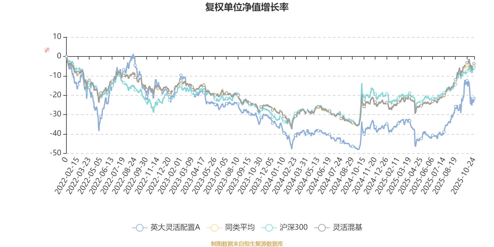 截至10月24日,英大灵活配置A近三个月复权单位净值增长率为20.69%,位于同类可比基金339/1287;近半年复权单位净值增长率为37.06%,位于同类可比基金293/1287;近一年复权单位净值增长率为25.70%,位于同类可比基金535/1287;近三年复权单位净值增长率为-3.45%,位于同类可比基金1023/1286。
