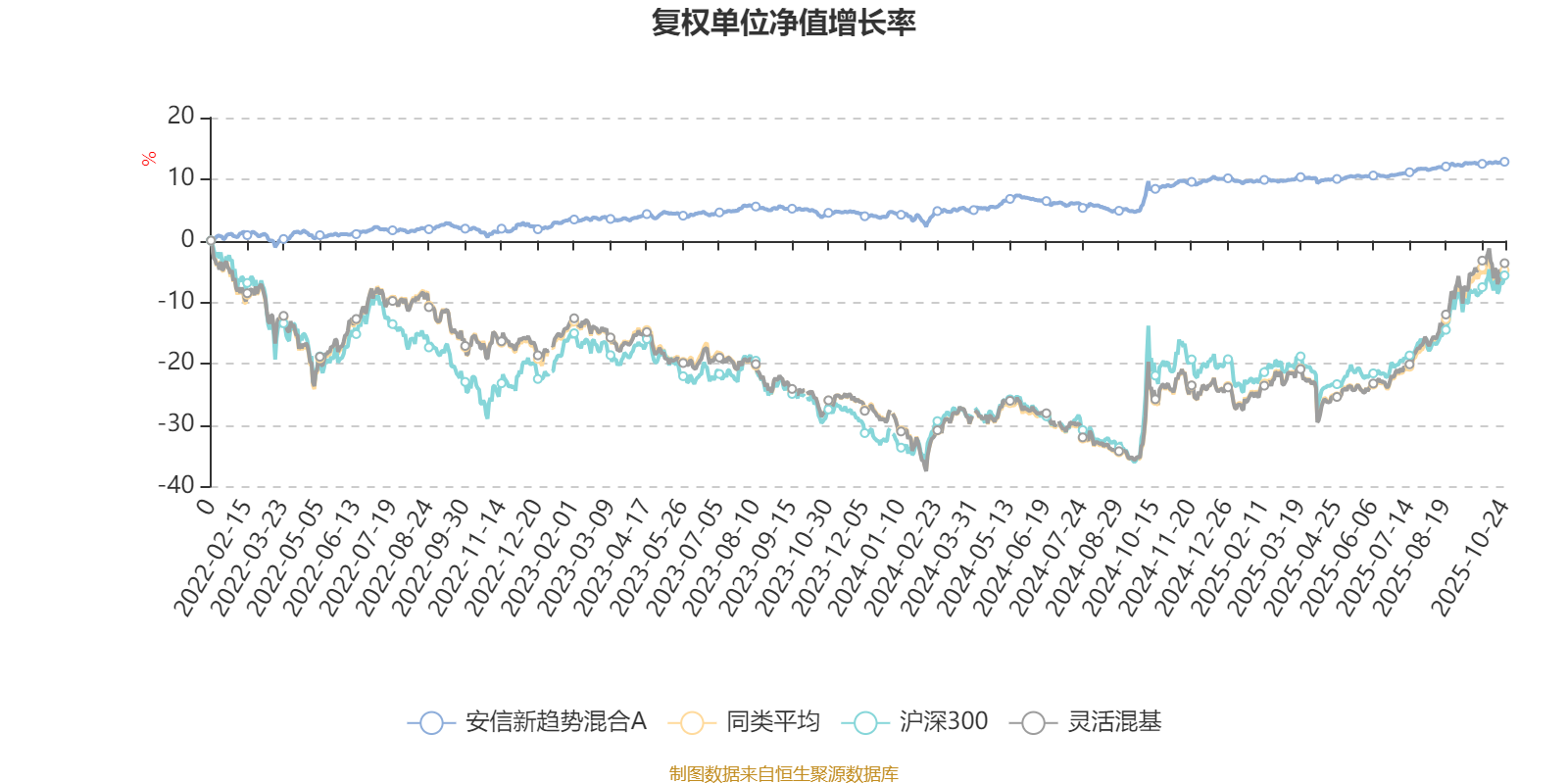 截至10月24日,安信新趋势混合A近三个月复权单位净值增长率为1.00%,位于同类可比基金1150/1287;近半年复权单位净值增长率为2.55%,位于同类可比基金1219/1287;近一年复权单位净值增长率为3.78%,位于同类可比基金1171/1287;近三年复权单位净值增长率为11.35%,位于同类可比基金701/1286。