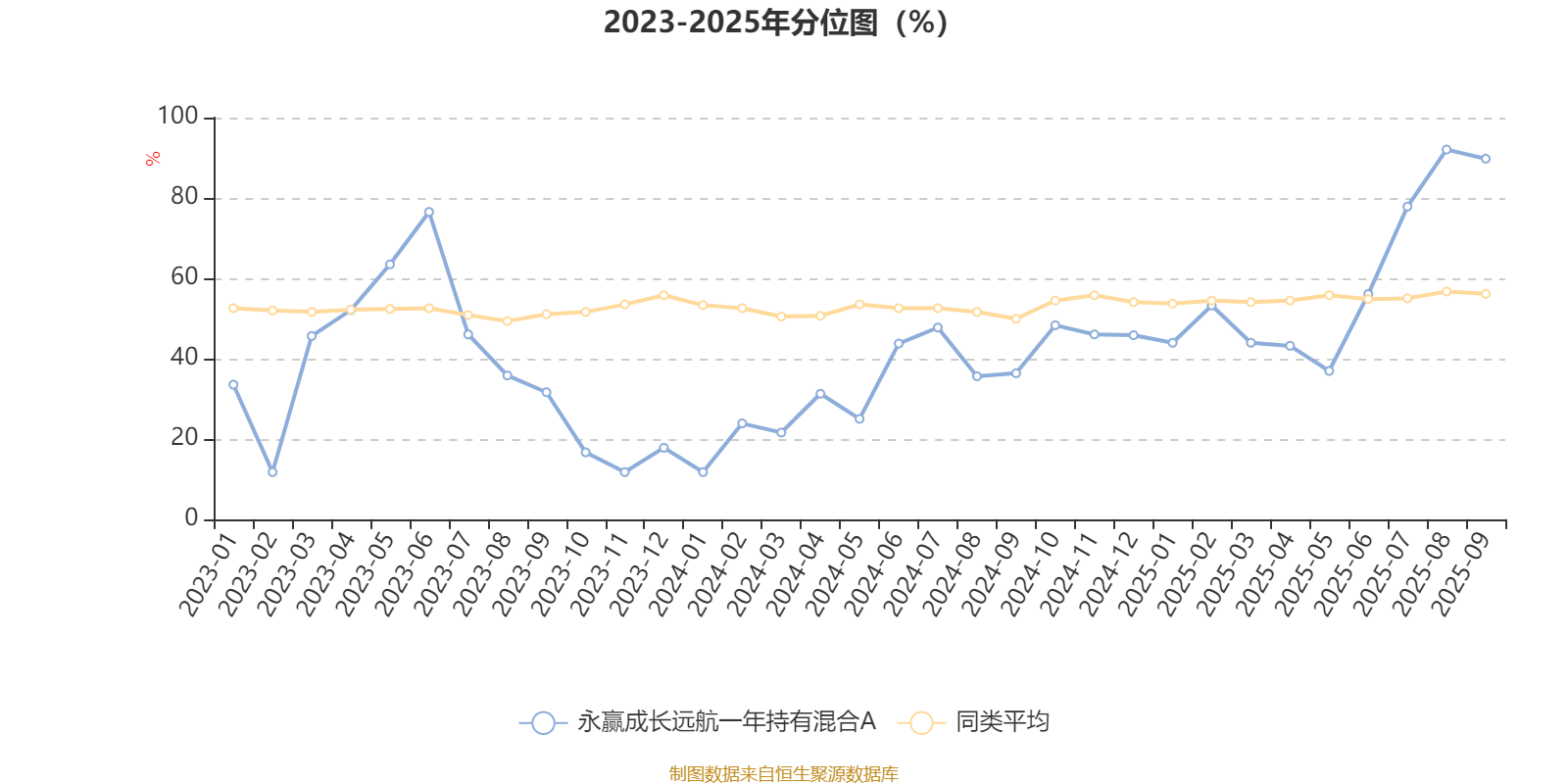 通过所选区间该基金净值增长率分位图,可以观察该基金与同类基金业绩比较情况。图为坐标原点到区间内某时点的净值增长率在同类基金中的分位数。