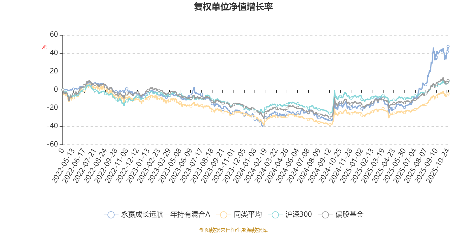 截至10月24日,永赢成长远航一年持有混合A近三个月复权单位净值增长率为47.13%,位于同类可比基金17/621;近半年复权单位净值增长率为86.83%,位于同类可比基金11/618;近一年复权单位净值增长率为77.84%,位于同类可比基金19/611;近三年复权单位净值增长率为49.62%,位于同类可比基金62/518。