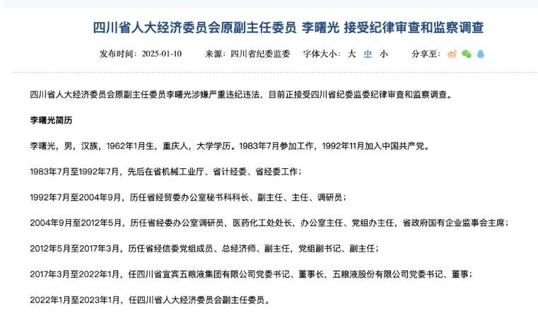 据四川省纪委监委消息,日前,经四川省委批准,四川省纪委监委对四川省人大经济委员会原副主任委员李曙光严重违纪违法问题进行了立案审查调查。