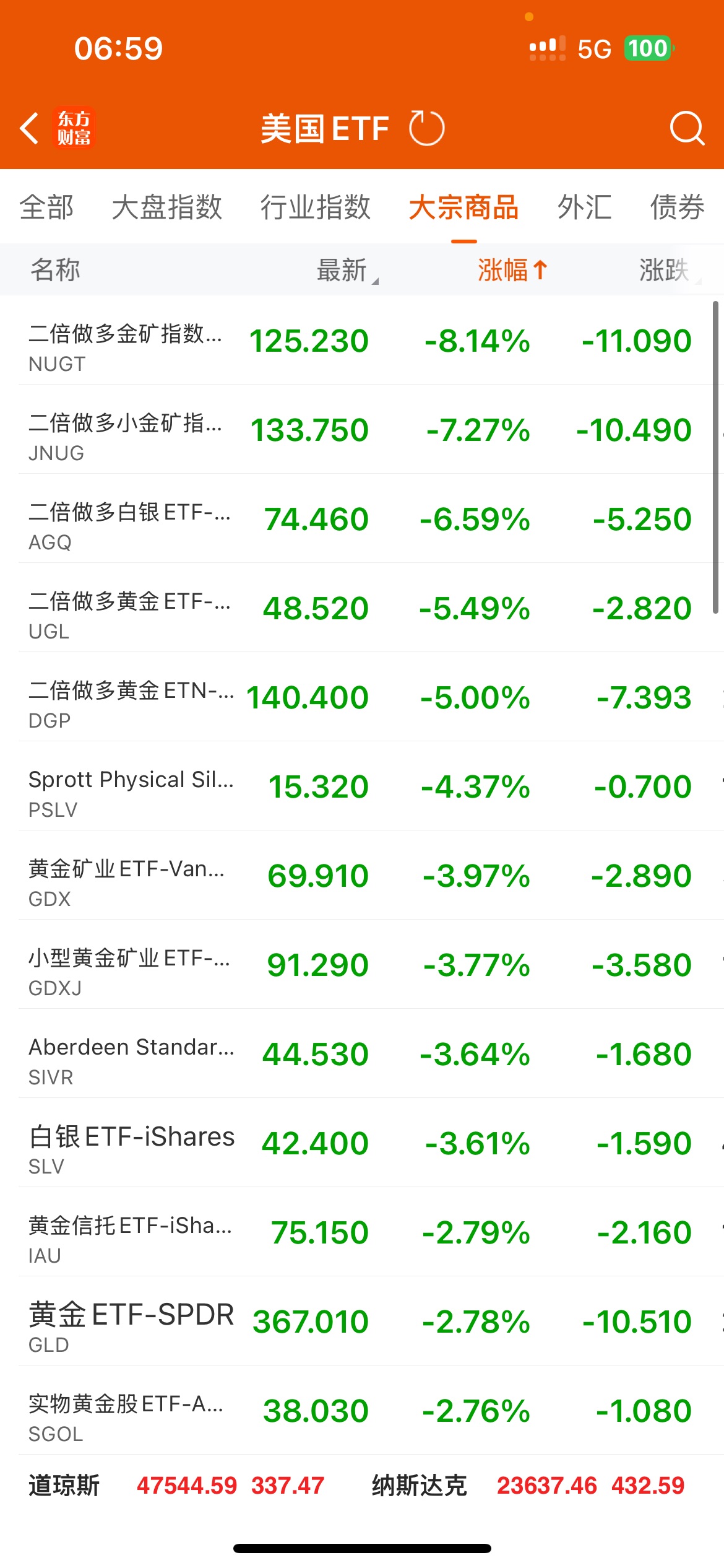 2倍做多白银ETF-ProShares(AGQ.US) 跌6.59%,成交额3.06亿美元。