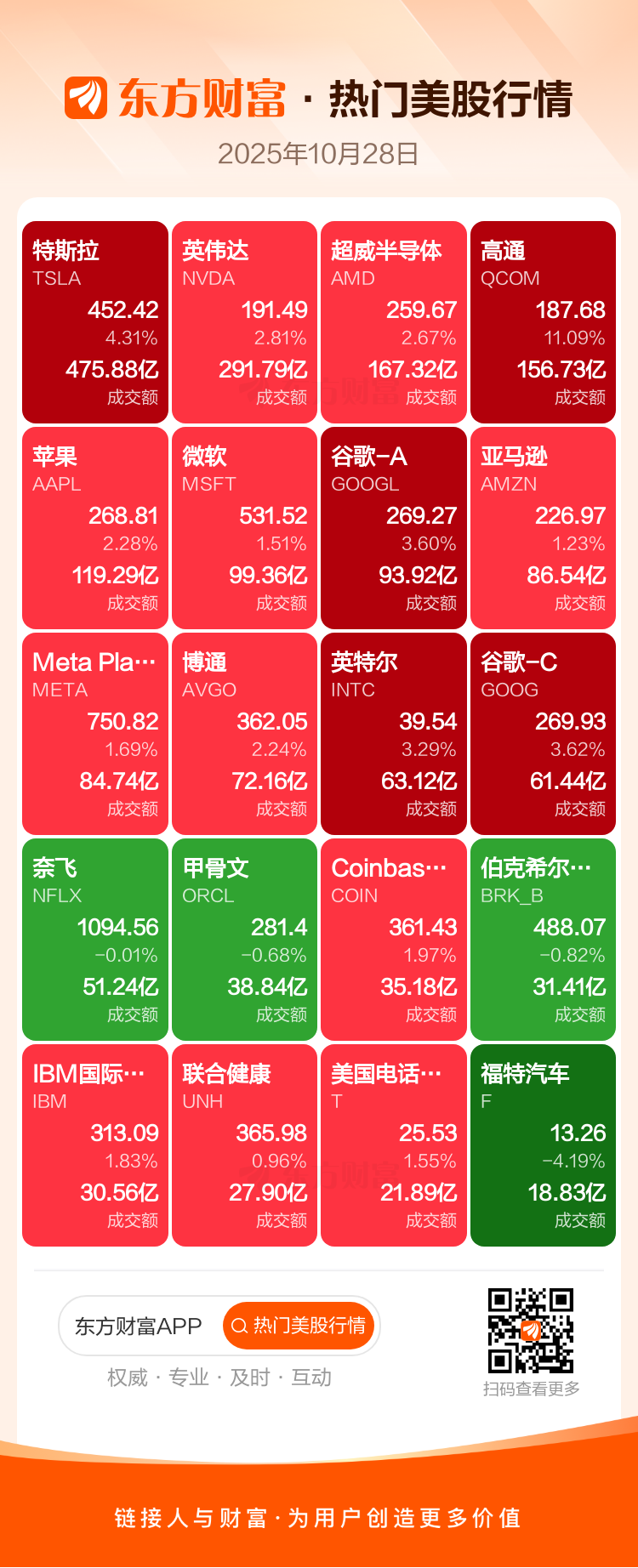 特斯拉涨4.31%,英伟达涨2.81%,超威半导体涨2.67%,高通涨11.09%,苹果涨2.28%,微软涨1.51%,谷歌-A涨3.60%,亚马逊涨1.23%,Meta Platforms Inc-A涨1.69%,博通涨2.24%。