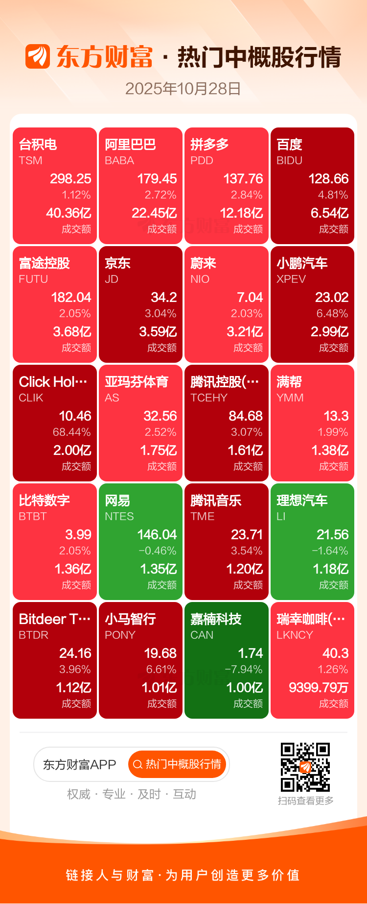 台积电涨1.12%,阿里巴巴涨2.72%,拼多多涨2.84%,百度涨4.81%,富途控股涨2.05%,京东涨3.04%,蔚来涨2.03%,小鹏汽车涨6.48%,Click Holdings Ltd涨68.44%,亚玛芬体育涨2.52%。