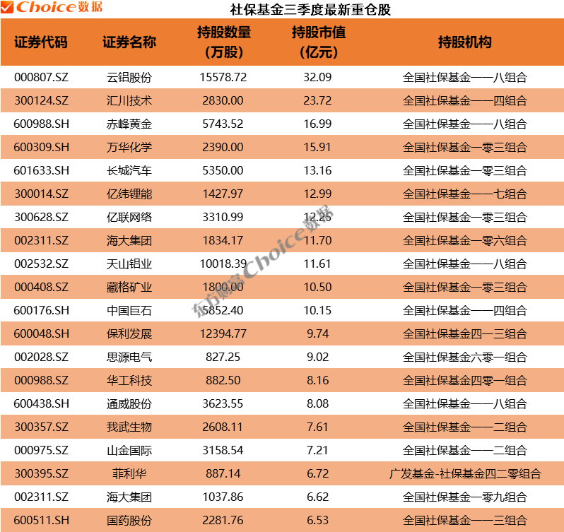 其中,全国社保基金一一八组合持有云铝股份1.56亿股,持股市值32.09亿元,还持有赤峰黄金16.99亿元、天山铝业11.61亿元;全国社保基金一一四组合持有汇川技术2830万股,持股市值23.72亿元;全国社保基金一零三组合持有万华化学15.91亿元。