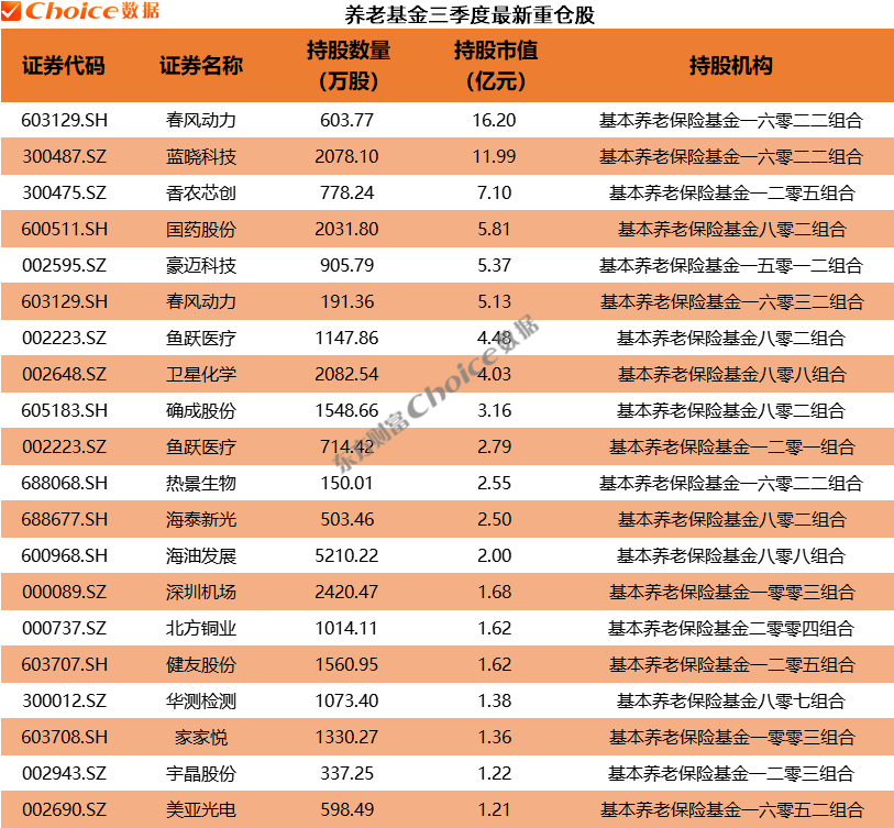 在已公布2025年三季报的上市公司中,养老基金持股市值最高的个股是春风动力,养老金一六零二二组合、一六零三二组合分别持有603.77万股、191.36万股,持股市值16.20亿元、5.13亿元;其次是蓝晓科技,一六零二二组合持有2078.1万股,持股市值11.99亿元。此外,一二零五组合持有香农芯创7.1亿元,八零二组合持有国药股份5.81亿元。