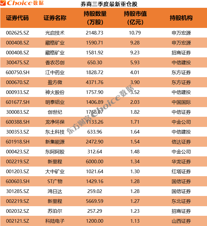 在已公布2025年三季报的上市公司中,申万宏源、招商证券分别持有藏格矿业1590.71万股、1581.92万股,持股市值9.28亿元、9.23亿元;申万宏源还持有光启技术10.79亿元。中信建投、东方证券分别持有香农芯创、江中药业5.93亿元、4.01亿元。