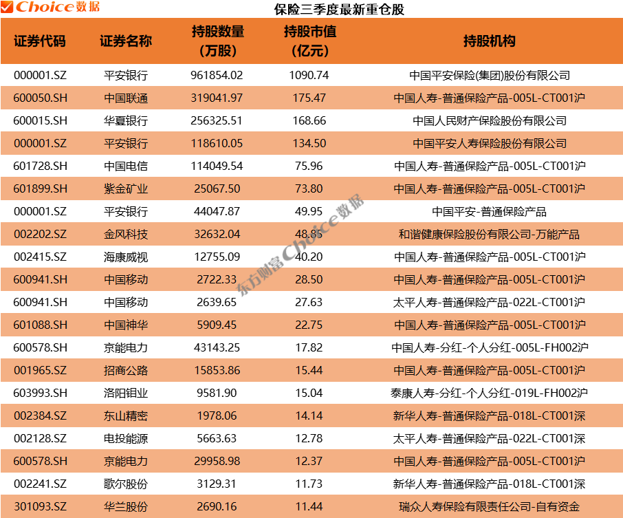 紫金矿业、金风科技、海康威视等被保险持有市值均超40亿元。