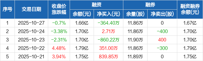 融资方面,当日融资买入1133.86万元,融资偿还1498.26万元,融资净偿还364.4万元。融券方面,融券卖出0股,融券偿还0股,融券余量11.86万股,融券余额33.68万元。融资融券余额合计1.67亿元。