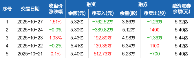 融资方面,当日融资买入1034.29万元,融资偿还1796.81万元,融资净偿还762.52万元。融券方面,融券卖出300股,融券偿还1.29万股,融券余量3.86万股,融券余额38.97万元。融资融券余额合计5.32亿元。