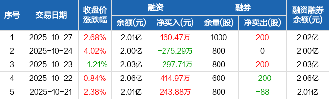 融资方面,当日融资买入1775.79万元,融资偿还1615.32万元,融资净买入160.47万元。融券方面,融券卖出200股,融券偿还0股,融券余量1000股,融券余额6.09万元。融资融券余额合计2.02亿元。