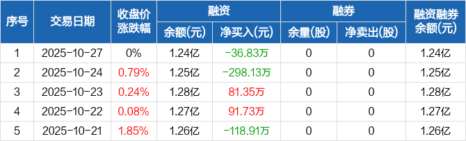金达莱:融资净偿还36.83万元,融资余额1.24亿元(10-27)