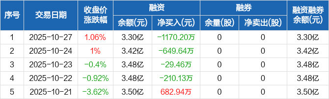 融资方面,当日融资买入1021.72万元,融资偿还2191.92万元,融资净偿还1170.2万元,连续4日净偿还累计2059.44万元。融券方面,融券卖出0股,融券偿还0股,融券余量0股,融券余额0元。融资融券余额合计3.3亿元。