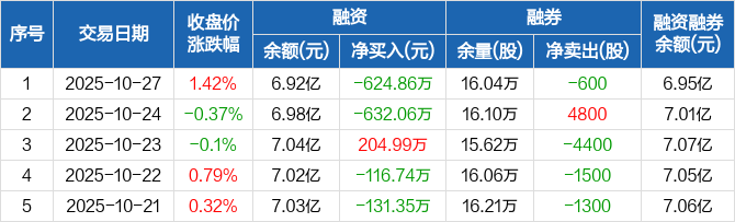 融资方面,当日融资买入2298.44万元,融资偿还2923.3万元,融资净偿还624.86万元。融券方面,融券卖出0股,融券偿还600股,融券余量16.04万股,融券余额308.69万元。融资融券余额合计6.95亿元。