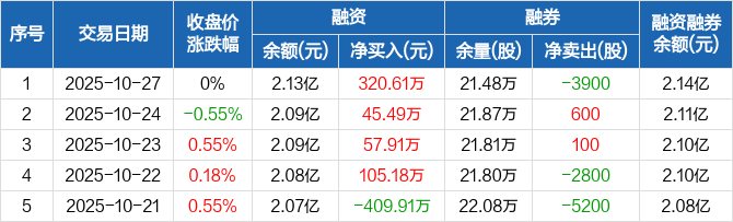 融资方面,当日融资买入749.63万元,融资偿还429.02万元,融资净买入320.61万元,连续4日净买入累计529.19万元。融券方面,融券卖出1700股,融券偿还5600股,融券余量21.48万股,融券余额117.3万元。融资融券余额合计2.14亿元。