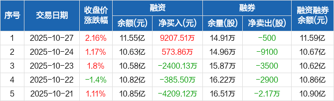 融资方面,当日融资买入2.11亿元,融资偿还1.19亿元,融资净买入9207.51万元。融券方面,融券卖出1600股,融券偿还2100股,融券余量14.91万股,融券余额409.7万元。融资融券余额合计11.59亿元。